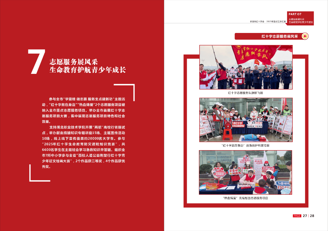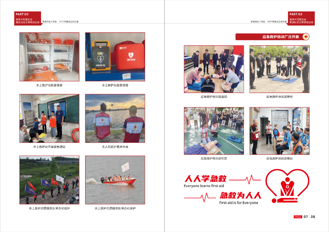 持续加强救援能力建设:举办孝感市2025年红十字水上救护演练活动,参与全市各类救援演练10场。参加全省首届红十字救援队水上救护大比武,“个人翻舟自救项目”获二等奖。主动参与“王者荣耀”全国大赛、登山大会、孝感马拉松、汉江徒步活动等救援救护保障。深入学校、社区、农村开展防溺水宣教活动140余场,受益群众超76200人次。