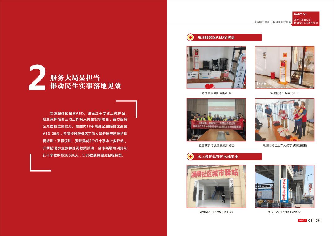 高速服务区配置AED、建设红十字水上救护站、应急救护培训三项工作纳入全市民生实事项目,着力提高公众自救互救能力。在域内13个高速公路服务区配置AED 26台,并同步对服务区工作人员开展应急救护科普培训;支持汉川、安陆建成2个红十字水上救护站,开展防溺水宣教和巡河救援活动;全市新增培训持证红十字救护员16586人,1.86倍超额完成目标任务。