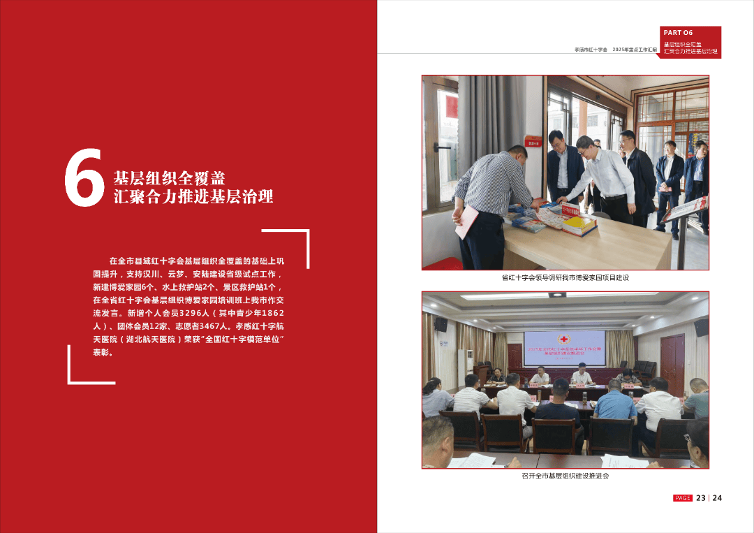 在全市县域红十字会基层组织全覆盖的基础上巩固提升,支持汉川、云梦、安陆建设省级试点工作,新建博爱家园6个、水上救护站2个、景区救护站1个,在全省红十字会基层组织博爱家园培训班上我市作交流发言。新增个人会员3296人(其中青少年1862人)、团体会员12家、志愿者3467人。孝感红十字航天医院(湖北航天医院)荣获“全国红十字模范单位”表彰。