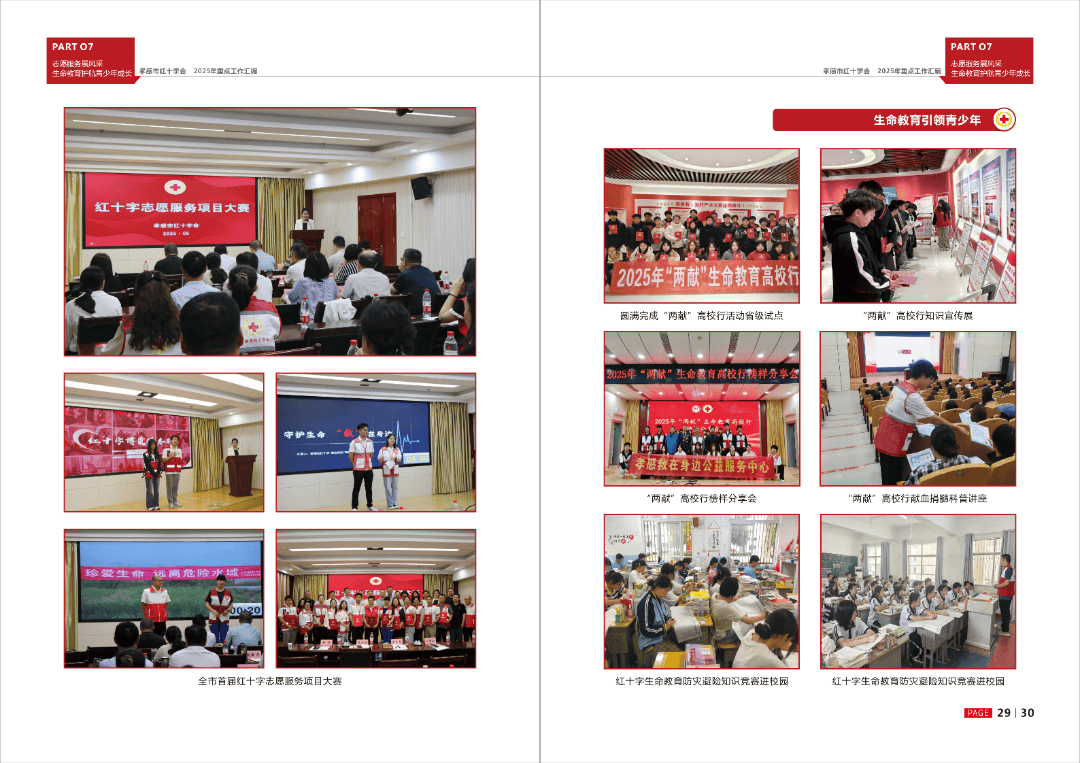 支持湖北职业技术学院开展“两献”高校行省级试点,举办献血捐髓知识专题讲座15场、主题宣传活动10场,线年红十字生命教育防灾避险知识竞赛”,共6600名学生在主题班会学习急救知识并答题。组织全市7所中小学参与全省“百校人道公益荆楚行红十字青少年征文绘画大赛”,2个作品获二等奖,4个作品获优秀奖。