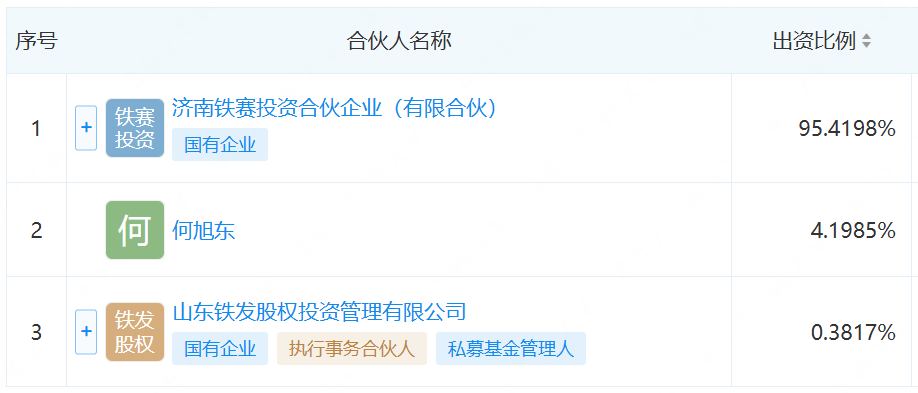 省级平台济南铁赛投资占据绝对主导,持股95.42%,自然人何旭东与基金管理人山东铁发股权投资管理有限公司分别持股4.20%、0.38%,后者同时担任执行事务合伙人。