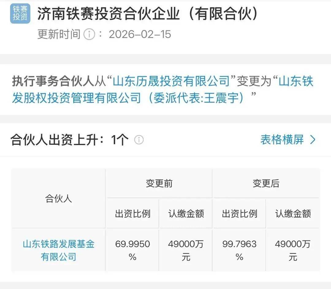 今年2月,山东铁路发展基金有限公司的出资比例从69.7%大幅跃升至99.8%,原外部股东退出,山东铁发股权投资管理有限公司作为新增合伙人暨执行事务合伙人加入。