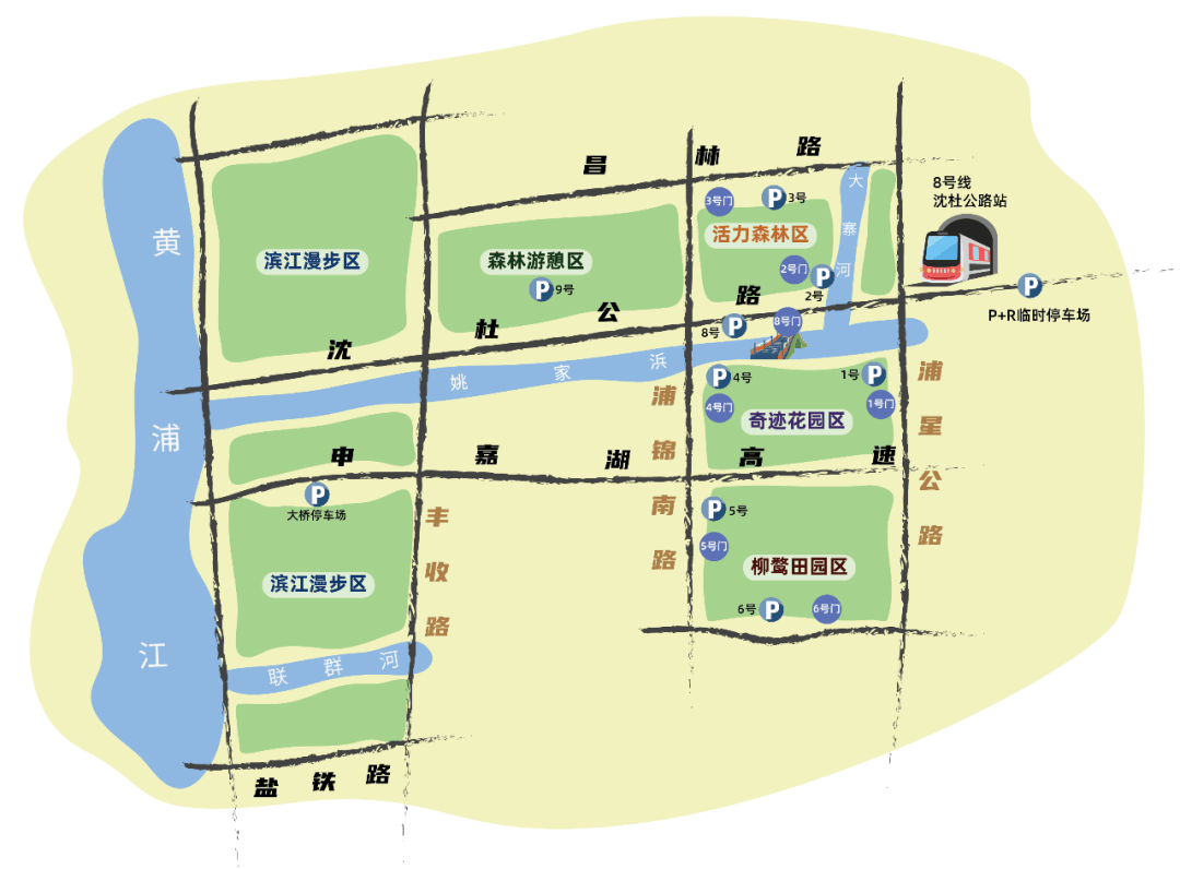 奇迹花园区P8(推荐)、P1、P4正常开放,柳鹭田园区P5、P6正常开放,森林游憩区P9正常开放,活力森林区P2、P3正常开放。