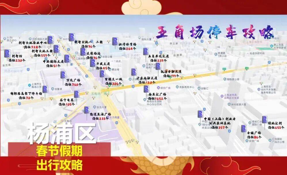 除此之外,杨浦交警还将周边的创智天地停车场、江湾体育场停车场等停车资源,集合在五角场商圈停车攻略里面,方便出游市民有的放矢寻找停车空间。