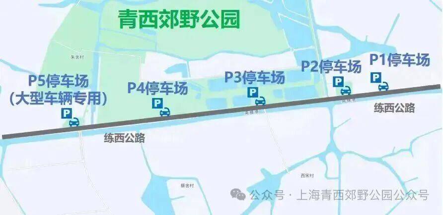 青西郊野公园停车场位于练西公路P1、P2、P3、P4以及P5(大型车辆专用)停车场。