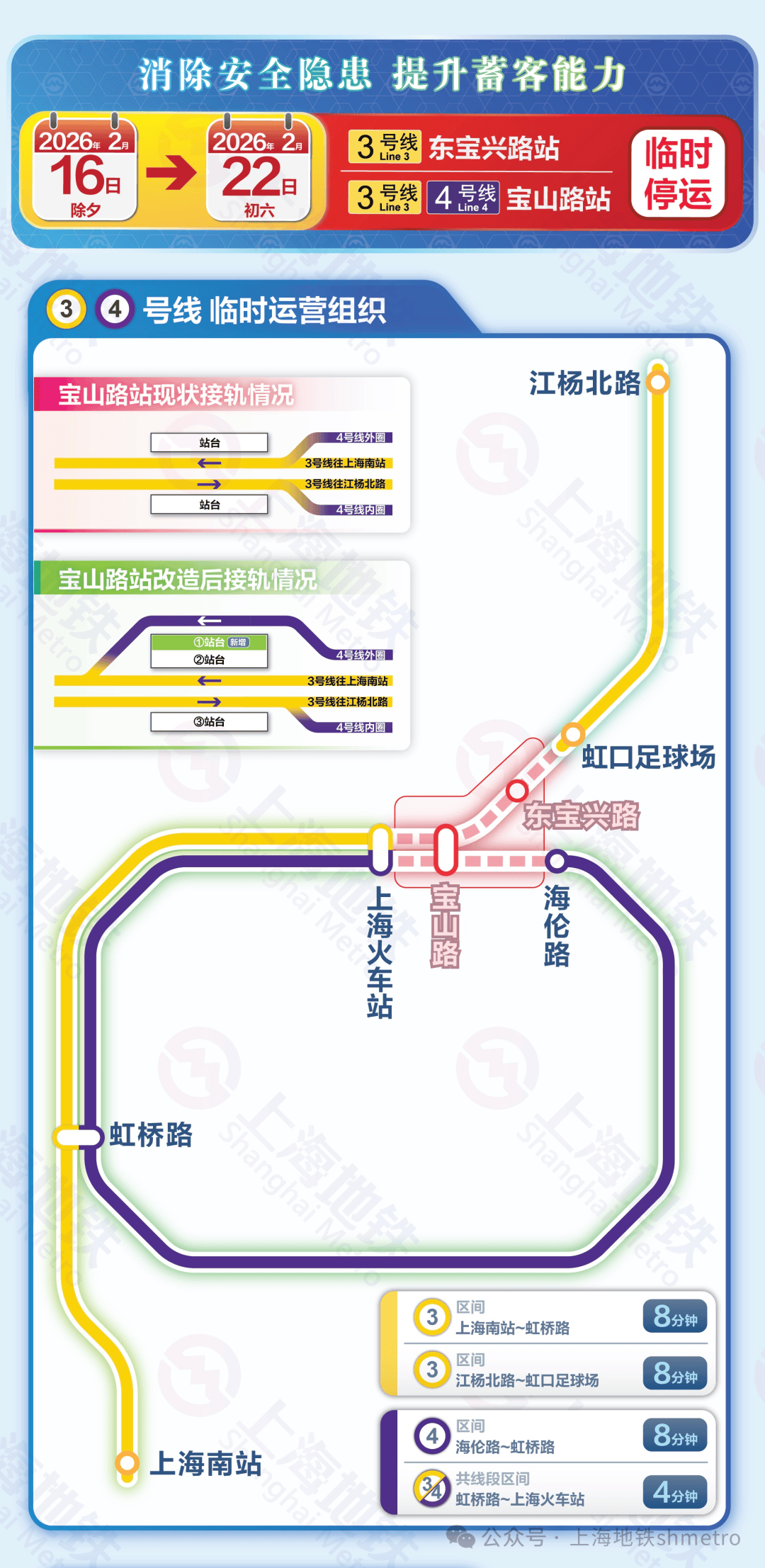 此次施工停运周期为2026年2月16日(除夕)至2月22日(初六),涉及3/4号线号线东宝兴路站,两座车站暂停运营服务。因此,3号线上海火车站站(不含)至虹口足球场站(不含)区段,4号线上海火车站站(不含)经宝山路站至海伦路站(不含)区段受此影响临时停运。
