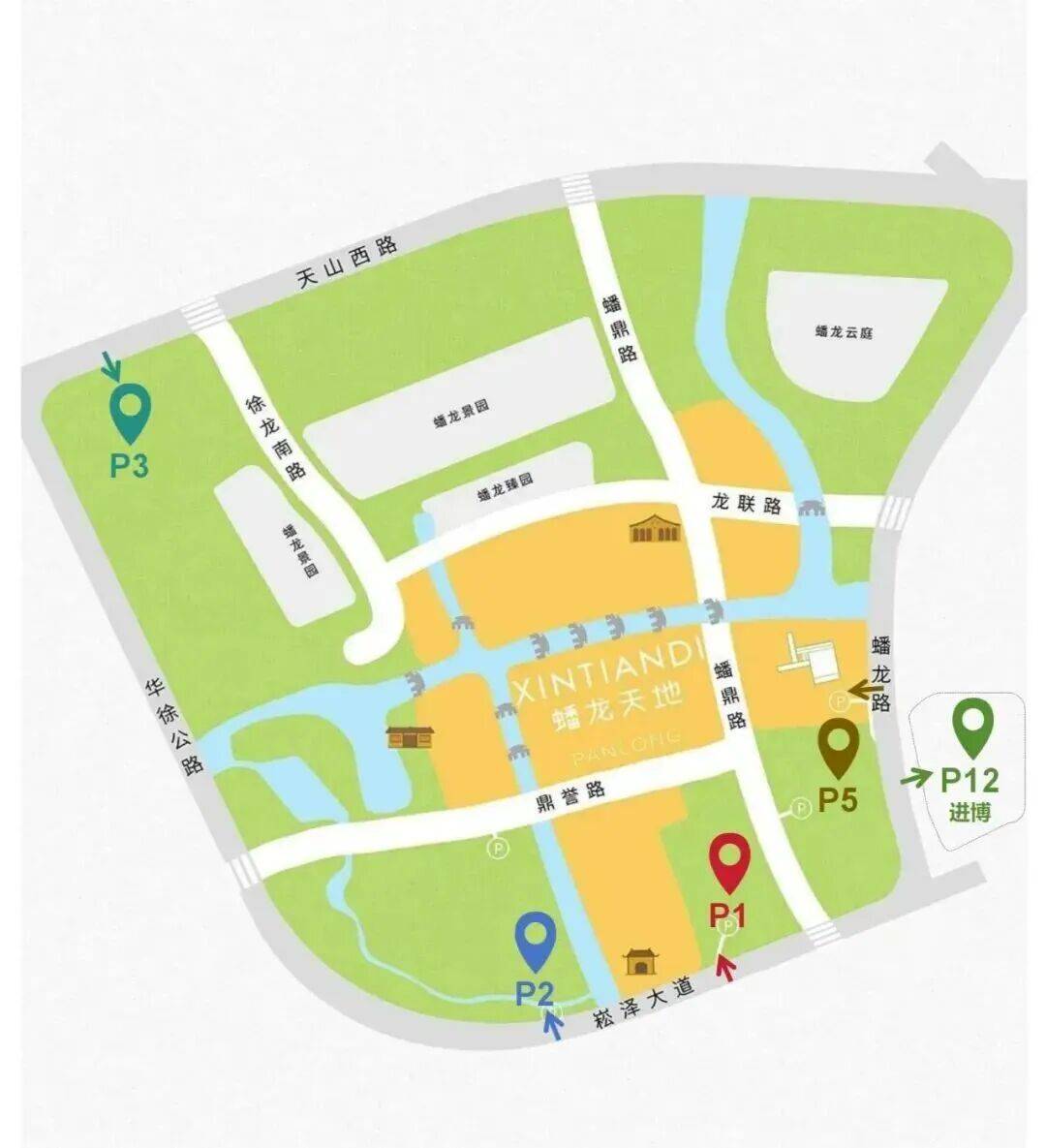 蟠龙新天地停车场包含内部P1、P2、P3、P5停车场以及进博P12(蟠龙路)停车场。