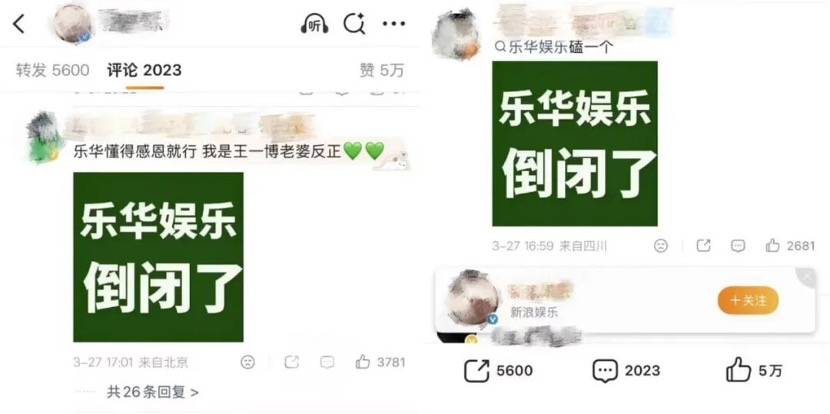 消息公开后,“乐华娱乐倒闭了”的绿色大字报被刷满了各大娱乐号的评论区,还有小部分极端粉丝,为此在微博上宣布脱粉。纵使内娱艺人粉丝厌恶自家经纪公司早已是常规操作,但王一博粉丝们的“恨”,在内娱生态里依然称得上是最有理有据的——这个“据”,就是乐华娱乐自家财报。