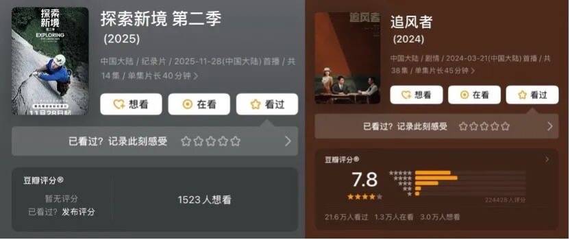 尽管小鱼身边很多爱好攀岩的朋友(非王一博粉丝)都对这档纪录片赞不绝口,但从豆瓣数据看,关心这档小众运动的路人并不多——第二季迄今只有1500多人标记了想看,而作为对比,由王一博主演的《追风者》有超过20万人标记了看过或想看。
