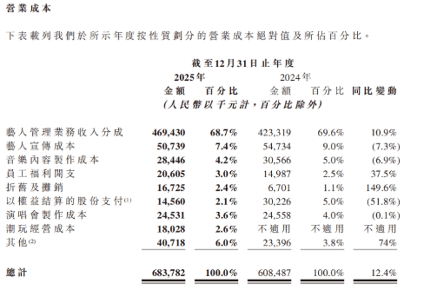 事实上,即便王一博不是乐华股东,他依然能从乐华拿走大量“分成”。乐华财报显示,公司最大的成本开支是艺人分成,占总成本的七成。2025年,这项成本接近4.7亿元,是2019年的2倍(2.4亿元),而这一年公司的总营收是9亿,净利润仅仅只有8000万,不到10%。