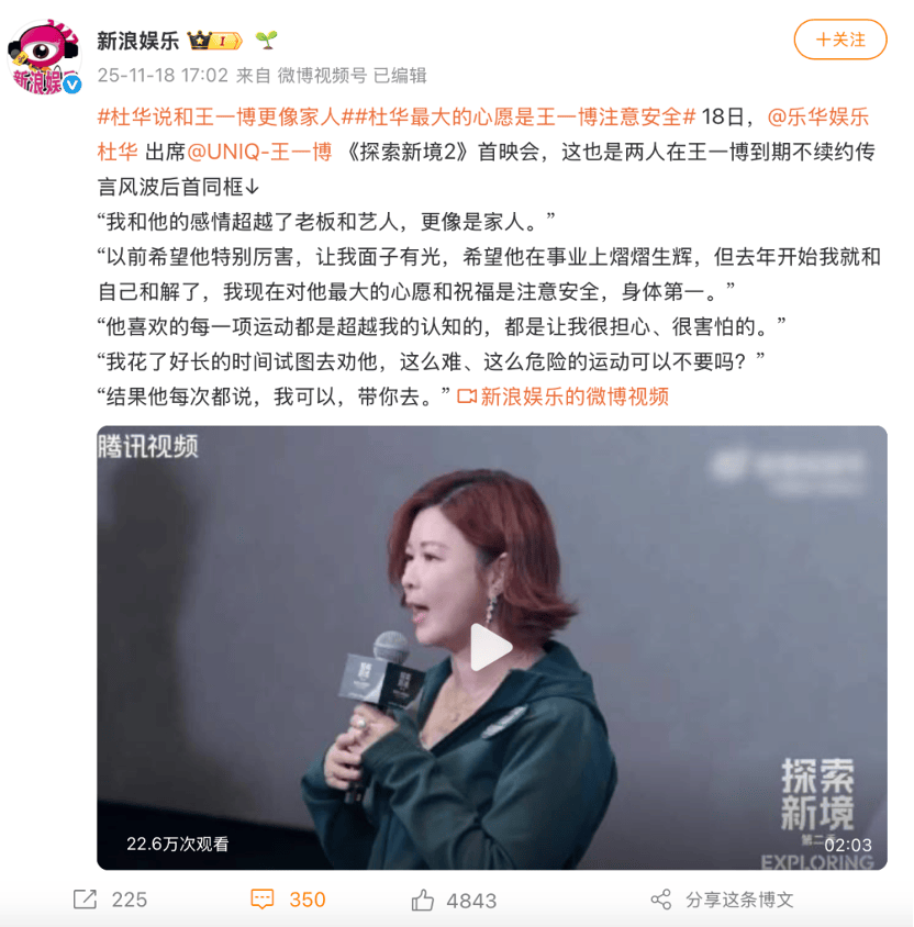 至于乐华,纵使在粉丝眼里有千般不好,但至少在王一博想要做自己这件事上,还是给了他足够多自由的——或者说,不得不给他自由。两年间,他几乎没有接影视项目,把大量时间投入到一档小众纪录片和高风险户外运动上,这些选择在商业逻辑上都不是最优解,但乐华没有阻拦——这本身就是“给自由”最直接的证据。在《探索新境2》发布会上,杜华曾这么评价王一博:“以前特别希望他特别厉害,让我有面子有光,希望他在事业上熠熠生辉。但从去年开始,我跟自己和解了,现在对他最大的期愿是注意安全、身体第一,不要太去冒险了。”